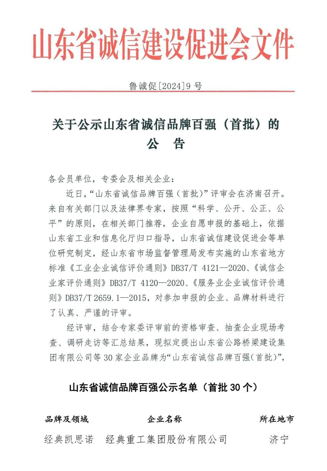近日,山東省誠信建設(shè)促進(jìn)會發(fā)布了《關(guān)于公示山東省誠信品牌百強(qiáng)(首批)的公告》,其中經(jīng)典重工集團(tuán)股份有限公司“經(jīng)典凱思諾”品牌成功入選。