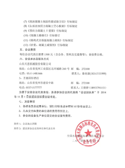 11月7日-9日全國(guó)水泥制品標(biāo)準(zhǔn)化技術(shù)委員會(huì)2014年年會(huì)暨標(biāo)準(zhǔn)審查會(huì)在山東天意機(jī)械股份有限公司隆重召開。屆時(shí),委員會(huì)相關(guān)領(lǐng)導(dǎo)及行業(yè)相關(guān)科研人員將蒞臨會(huì)議,共同商討制訂行業(yè)有關(guān)標(biāo)準(zhǔn)。誠(chéng)邀各界人士屆時(shí)蒞臨天意機(jī)械、經(jīng)典集團(tuán)、卓越精工參觀指導(dǎo)。