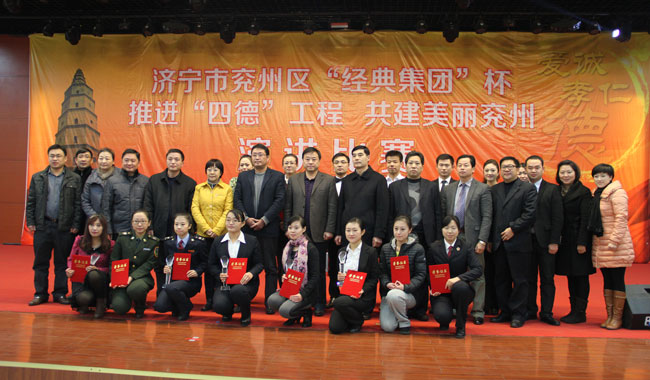 12月18日,濟(jì)寧市兗州區(qū)“經(jīng)典集團(tuán)杯”推進(jìn)“四德”工程共建美好兗州演講比賽決賽在經(jīng)典集團(tuán)舉辦。濟(jì)寧市委宣傳部副部長(zhǎng)、兗州區(qū)委副書記于慶軍,區(qū)委常委、宣傳部長(zhǎng)初建偉,經(jīng)典集團(tuán)董事長(zhǎng)苗樹文,總經(jīng)理杜福生等出席了活動(dòng)。